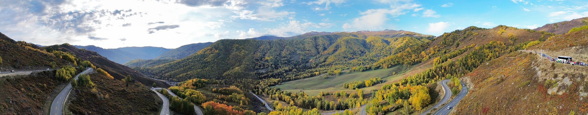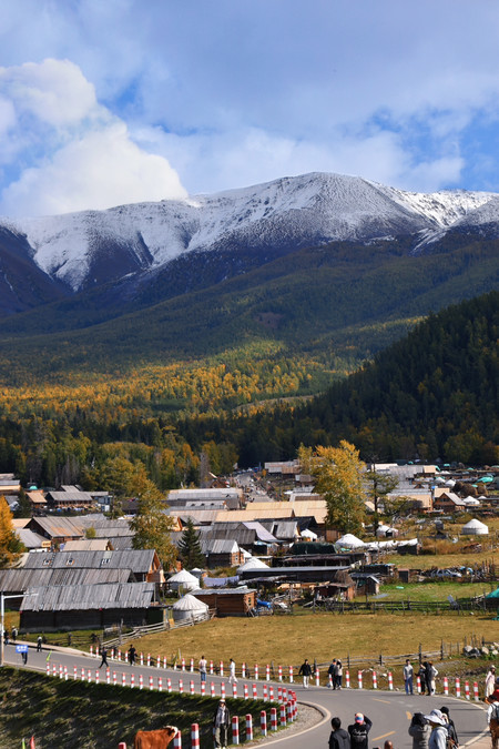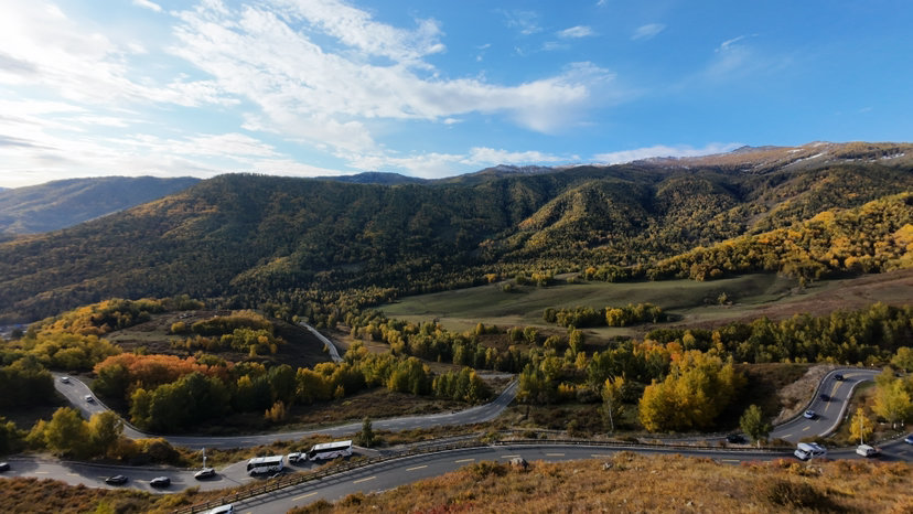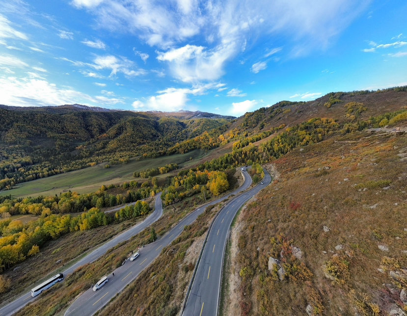 This trip really feels like Xinjiang, and the place like Altay is in Hemu, to be exact, in the beautiful peak village of Hemu. The road from Kanas to Hemu is the most prosperous place for autumn scenery on this trip! Looking down from the top of the Panshan Highway, the winding mountain road and the deep and shallow yellow in the distance merge into a colorful forest feast. Where you enter the eye, it is a grand and majestic collection of various yellows and reds.