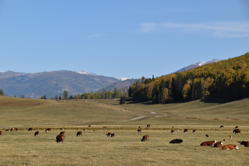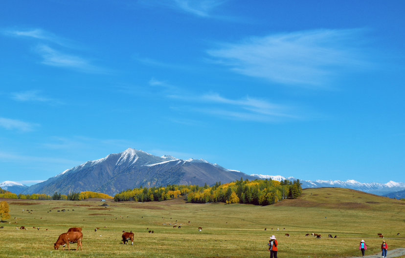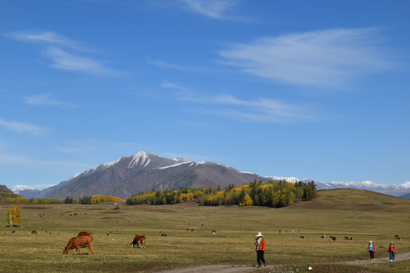 From Hemu Village to the observation platform, you can hike to the beautiful peaks, and you can also ride horses. Hiking can be played while walking. We are like Wenxiu, walking all the way to see and explore one or two. It took almost 4 hours to reach Beautiful Peak, but we have had enough fun and crazy enough all the way. Beautiful Peak is well worth visiting! Originally a small village where only one family lived, now there are only about 12 households. In the mountain valley under the snow-capped mountains, there are mountains on all sides, and in the place where the houses are connected to the mountains are large grasslands and birch forests. Cows and sheep are very comfortable lying down and eating grass, feeling at ease. Here you can really appreciate the feeling of snow-capped mountains, grasslands, birch forests, cattle and sheep, and wooden houses blending into one picture; here you can really appreciate the feeling of Xinjiang being so big, with so much land and so few people (there are really few people going); here you can really appreciate the feeling of Ba Tai riding a horse. Therefore, I say that this is the real Xinjiang, the real Altay!