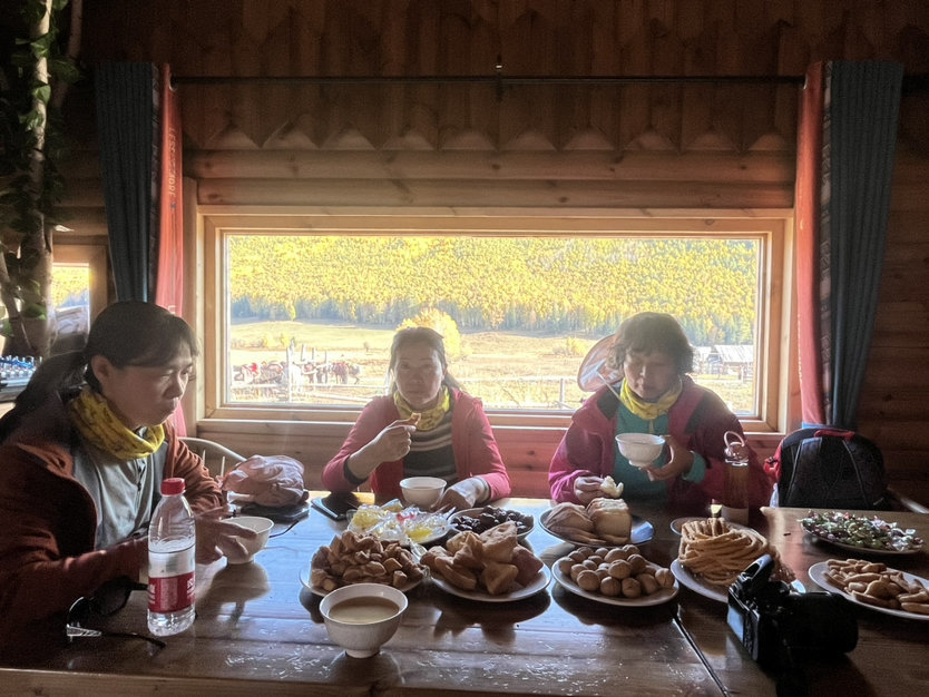 Why did you say that it was the best meal at the time, because we had a better meal in Wuerhe. After breakfast at 9:30 in the morning in Hemu, everyone took their luggage and went back to their bus at the entrance of the scenic spot, then left Hemu and went to Wuerhe. We entered Kanas from Baihaba, which can be regarded as entering through the back door. We left Kanas from Hemu this time, even if it was from the main entrance; then we saw a long queue of vehicles preparing to enter the scenic spot, which stretched for about ten kilometers, all queued up and blocked, waiting for the traffic police to release a few cars and a few cars. It was very shocking! At that time, I thought, fortunately, we are following the Vigilante, and there is no such traffic jam. If I were driving by myself, I would definitely turn around and stop playing immediately!