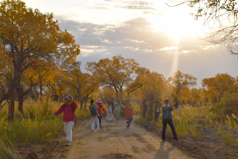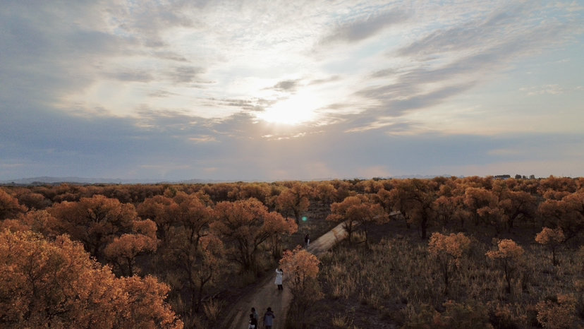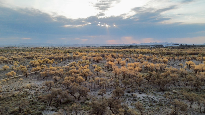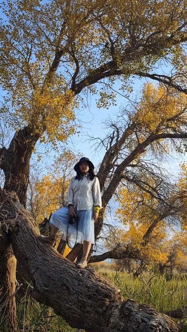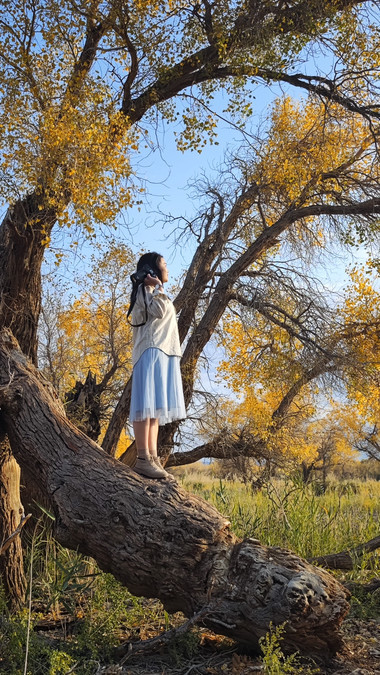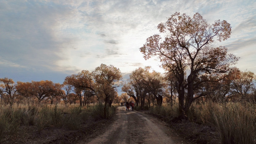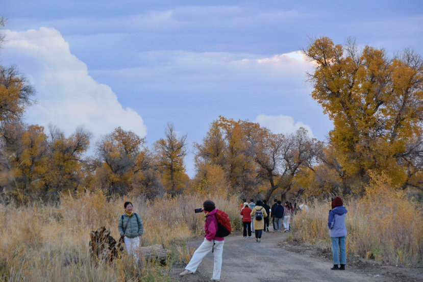 The Populus euphratica forest in Wuerhe is a new wild Populus euphratica forest. It was discovered by the leader of the Rovers during the treading process, and tickets were not charged before. Tickets started to be charged this year. With the local bus, there will be an additional fee for the local bus. We walked directly along the dirt road. The morning light gradually rose, passed through the clouds, and shone on the entire Populus euphratica forest. It was very spectacular. The little friends in twos and threes became part of the scenery. Everyone grabbed a fallen Populus euphratica tree and took pictures hard, several per person. Giant film.