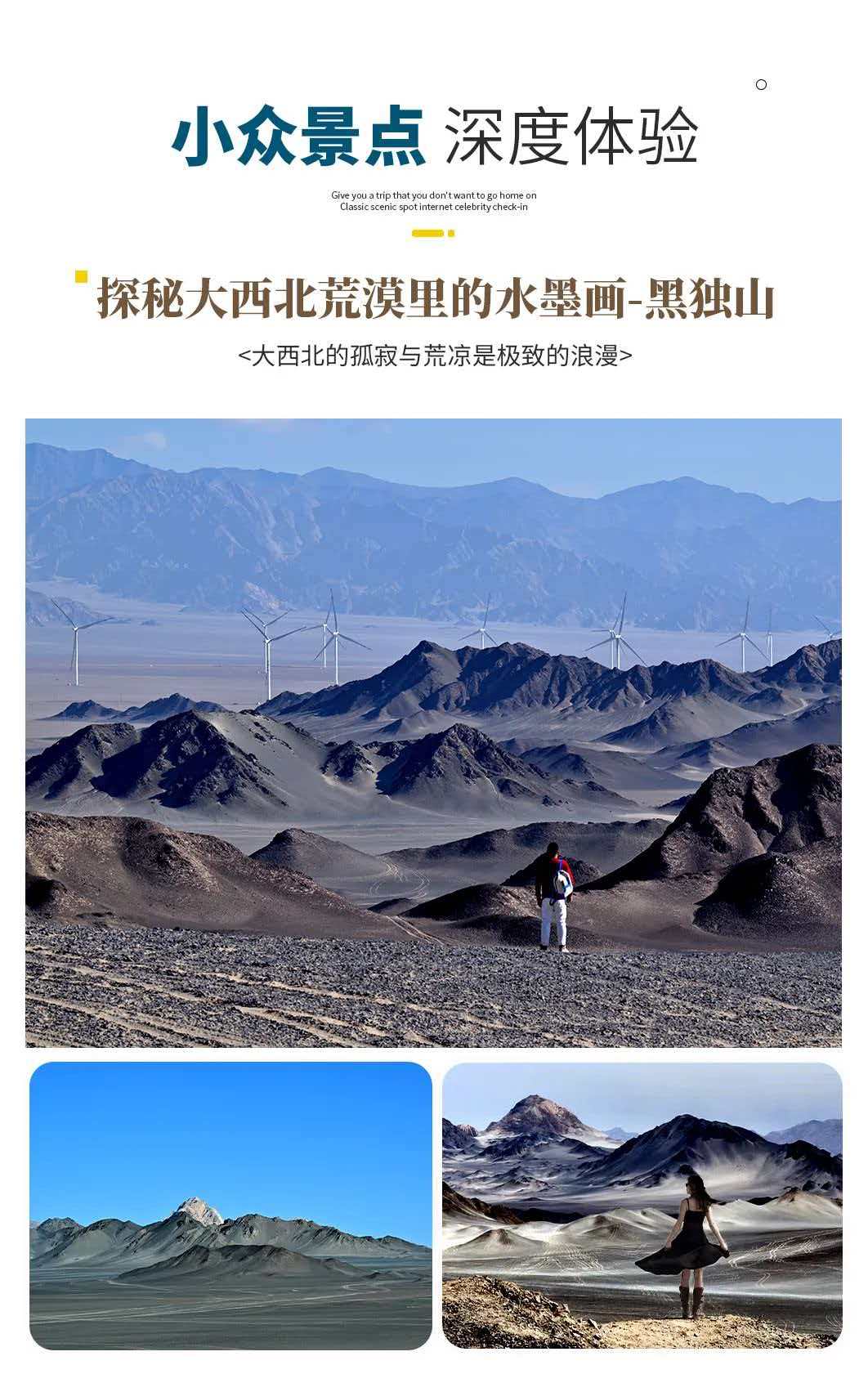 In the morning, start from Dachaidan and come to [Emerald Lake] (according to the time, the Emerald Lake may be adjusted to the afternoon tour of the third day, the sunset of the Emerald Lake is very beautiful). It was originally the mining area of the Salt Lake Mining Team of the Dachaidan Chemical Plant. From above, it is like a carefully processed high-quality jadeite and amber turquoise inlaid on the earth, which is beautiful and exciting. Then come to the ink painting country [Black Dushan Mountain] . This is a place like the moon. A paradise for tourists and a paradise for photographers. The reason why Black Dushan is unique is that the sand body is a layer of black gravel on the surface of the sand mountain. After a long time of baptism, the gravel becomes a layer of hard shell. Everyone who walks through Black Dushan Mountain will consider the end of life here. Its desolation, loneliness, and coldness can instantly attract you, making it difficult to tell whether it is in a painting or a dream. The snow-capped mountains in the distance are even brighter against the black backdrop.