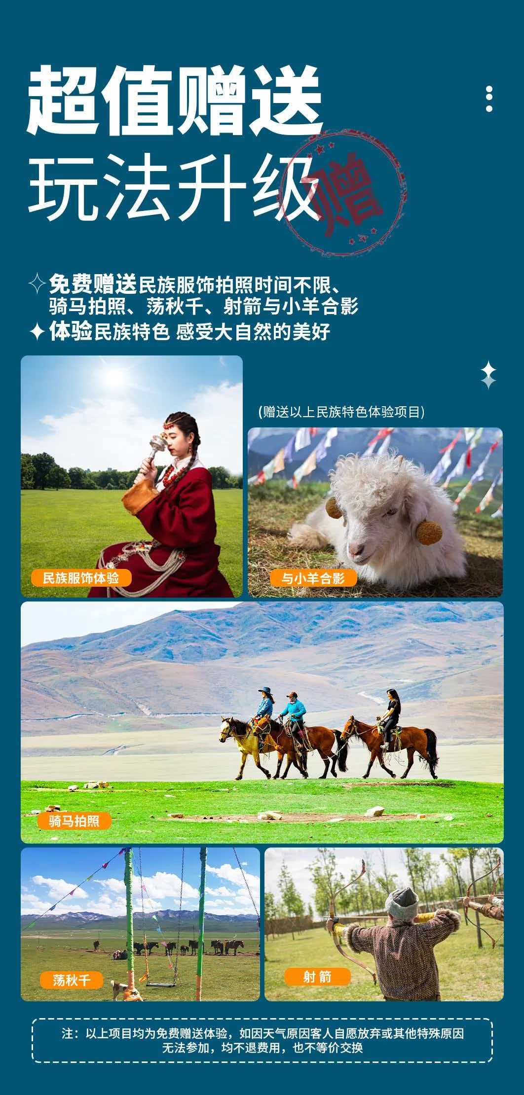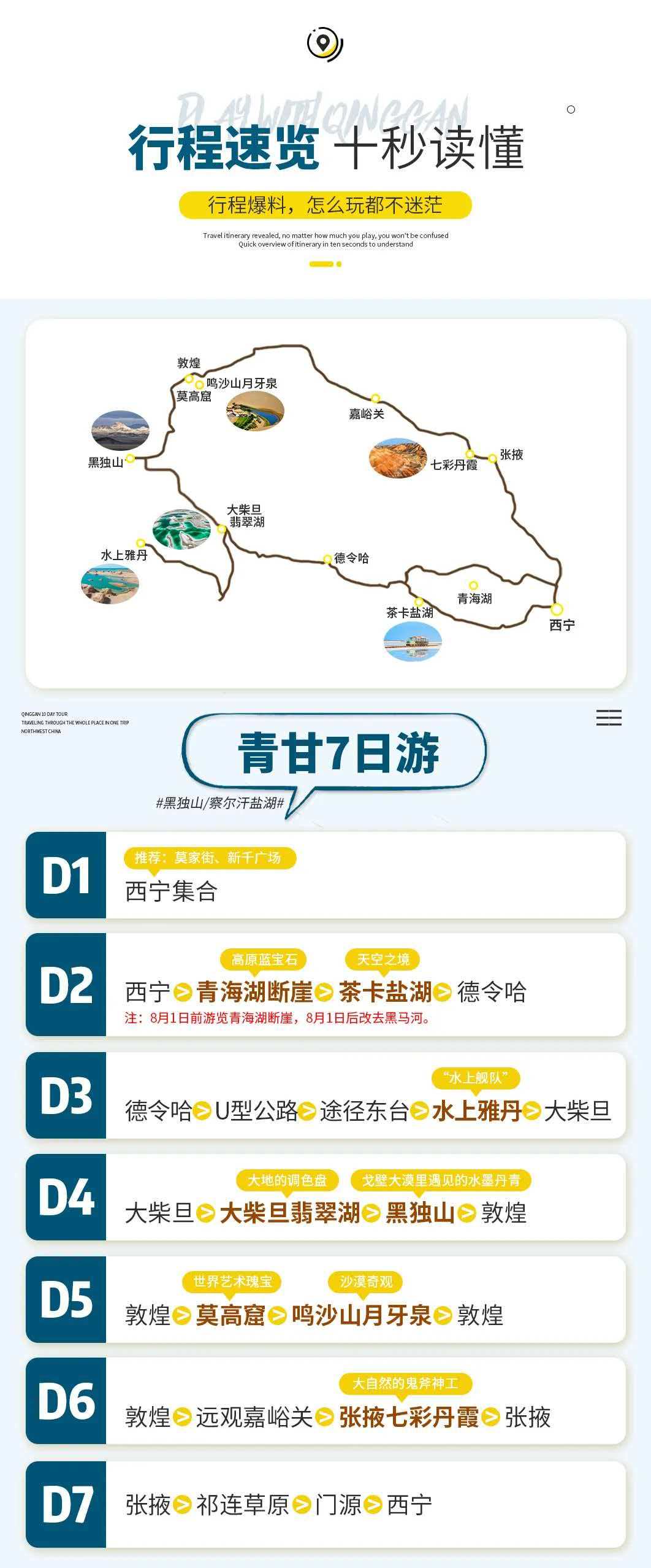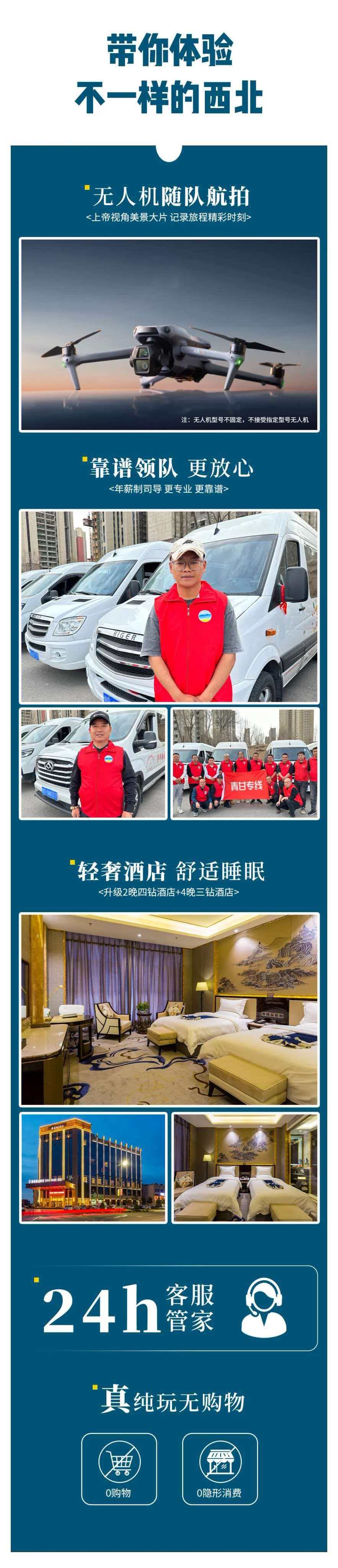 The above schedule is 2480 yuan/person 05 Dunhuang - Mogao Grottoes - Mingsha Mountain Crescent Spring - Dunhuang The above schedule is 3480 yuan/person Children 1780 yuan/person, single room difference of 500 yuan/person (Note: children's price does not account for the bed and does not include tickets) (The above price is the price of the group, if you need to form an independent group, you can consult separately) Free maximum insurance for the whole process 500,000 tour accident insurance Reception standard, fee instructions: The fee includes [Accommodation] 6 nights hotel (2 nights Four Diamonds Hotel + 4 nights Three Diamonds Hotel) (Reference Hotel: the following hotel or similar) Xining luxury hotel Jinding Licheng Hotel/Guoluo Hotel/Tianli Hotel/Yicai New Silk Road/Combo/similar; Delingha Comfort Hotel Yuhao Hotel/Yunhu Hotel/Xingcheng Hotel/Oriental Hyatt/Jinling Dele/Star City/similar; Dachaidan Comfort Hotel Pixel Hotel/Xiangya Hotel/Chengyue Sunshine Hotel/Xinjin Hotel/Haoyu Hotel/Same level; Dunhuang Comfort Hotel China Travel Jingxuan Hotel/Anhe Hotel/Huanyu Hotel/Longju Hotel/Chengheshun Hotel/Jiuselu Hotel/Yangguan Hengxi/Same level; Zhangye High-end Hotel Ducheng Holiday Inn/Ruichi International Hotel/Silk Road Ruihua Hotel/Hengda Regency Hotel/Mingjiale International Hotel/Same level; [Transportation] Charter fee for Qinghai Gansu car (including fuel tolls), the specific model is arranged according to the number of people, 5 seats, 7 seats, 9 seats ... Designated models are not accepted, and each model is subject to full capacity. [Tickets] Chaka Salt Lake, Water Yadan, Dachaidan Emerald Lake, Mingsha Mountain Crescent Spring, Colorful Danxia [Lead] led by experienced drivers. (The driver is the main driver, and will arrange tickets, accommodation and simple itinerary introduction for everyone. Professional explanations are not provided. Please understand.) [Meal Fee] 6 breakfasts throughout the journey. [Drone] The team is equipped with a drone, one drone for every 3 to 4 cars. The driver will choose 1-2 scenic spots to take aerial photos for the guests [Drop-off] At the end of the trip, you can directly deliver it to Xining Airport, station or city hotel for free Gift items 1. Gift Qilian Prairie riding photos, archery, ethnic clothing/prayer flags photos; 2. Free drone aerial photography, (Dachaidan Emerald Lake aerial photography); 3. Free 500,000 insured travel accident insurance; 4. Complimentary mineral water on board; (Note: If the gift item cannot be given for special reasons, the fee will not be refunded) The fee does not include [Large transportation] There is a large transportation to and from Xining all over the country, and the train or plane is at your own expense. [Meal fee] The fee includes the meal fee other than the meal. About the meal 1. We believe that food is the part that best reflects the local culture, and we hope that the group members can discover the local food by themselves during the journey, rather than we prepare a cookie-cutter group meal for you in advance, the joy and charm of which will only be known if you try it yourself. 2. Some destinations have less delicious food to discover. Considering the different eating habits of each person, in order to respect each team member, we do not include meals on most of the itinerary. In this case, everyone can order together or eat separately. [Small traffic in scenic spots] Qinghai Lake transportation car is 40 yuan/person, Zhangye colorful Danxia sightseeing car is 38 yuan/person; Water Yadan sightseeing car is 60 yuan/person; Heidu Mountain small traffic is 60 yuan/person; [Tickets] Mogao Grottoes tickets are 238 yuan for Class A, or 100 yuan for emergency tickets. Tickets are tight. Please make an appointment on the official website in advance after registration; Jiayuguan tickets are 110 yuan [Personal consumption] Local participation in self-funded projects and other projects not included in the "fee included". [Single room difference] The itinerary and accommodation are arranged according to the double room. The registration of individual group members will be arranged in the order of same-sex room sharing. If you can't fight or bring children of the opposite sex or need to live alone, please make up for the single room difference. [Pick-up] You can provide Xining Airport to hotel pick-up service, five-seater car 100 yuan/car Refund and change rules Refund the ticket fee within one or five days. 2. If you withdraw from the group within 10 days, you will be refunded 50% of the group payment. If you withdraw from the group after 3 or 10 days, you will be refunded the full amount of the group payment. Remarks: 1. Elderly people over 65 years old need to be accompanied by family members and signed for exemption, and those over 70 years old will not be accepted 2. The seats on the car are changed in turn (seating requirements are not provided) Warm reminder, registration instructions [Itinerary Remarks] 1. Children: (referring to height of 1.2 meters and below); the fee only includes parking spaces and insurance costs, does not occupy beds, does not include breakfast, and does not include tickets to scenic spots. Note: 1 large and 1 small registration cannot be arranged to share rooms. Please make up for the room difference and live alone. Please understand! 2. The cost of the itinerary is increased due to human irresistible factors (natural disasters, traffic conditions, government actions, etc.). The company will not refund the unincurred costs. Our agency can make itinerary adjustments and try our best to ensure the smooth progress of the itinerary. If it is impossible to implement the agreed plan, the excess cost due to the change shall be borne by the tourist. 3. The journey time in the itinerary is the reference time in the case of no traffic jams, and does not include the tour time of the scenic spots; in the case of no reduction in scenic spots, our agency has the right to adjust the o