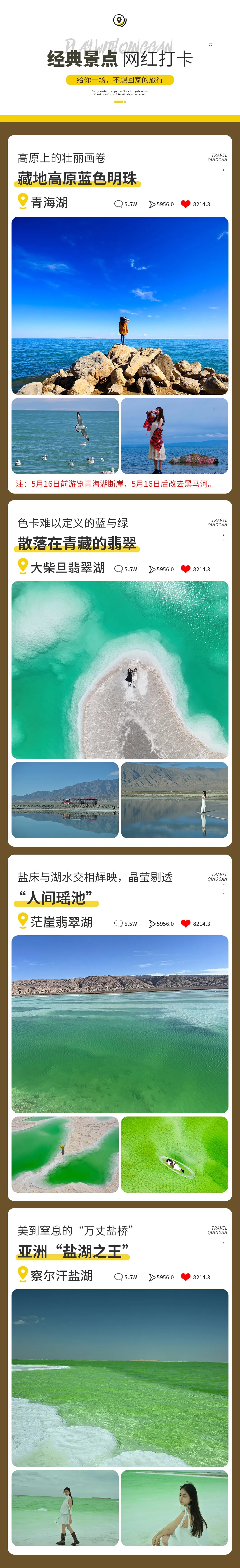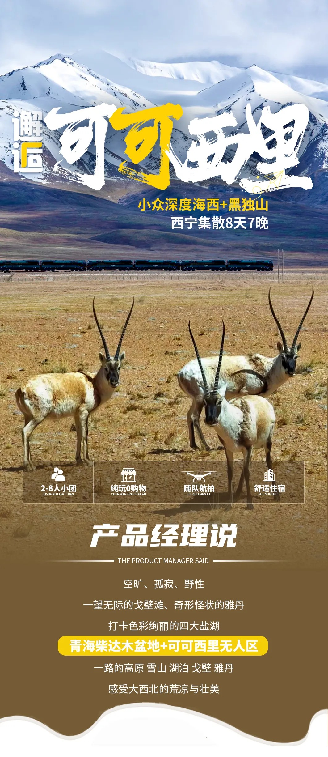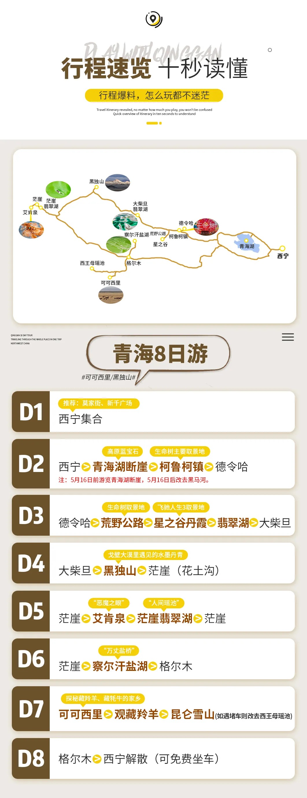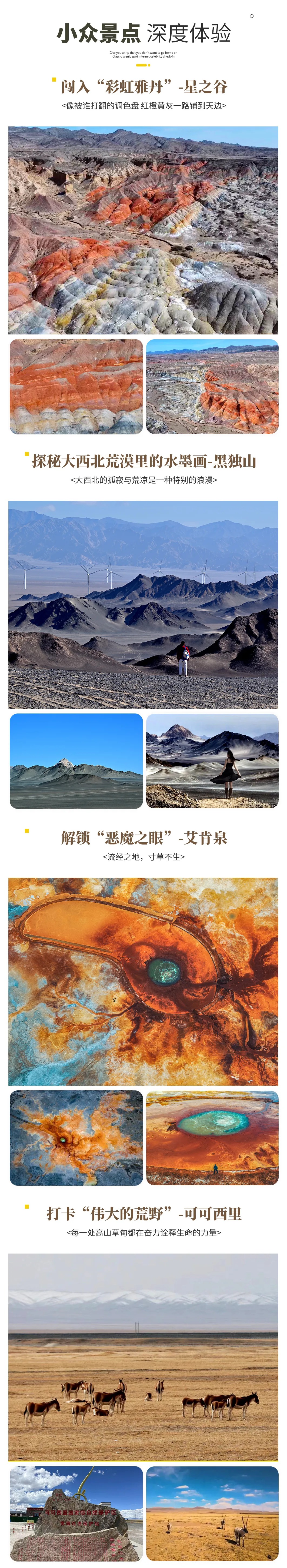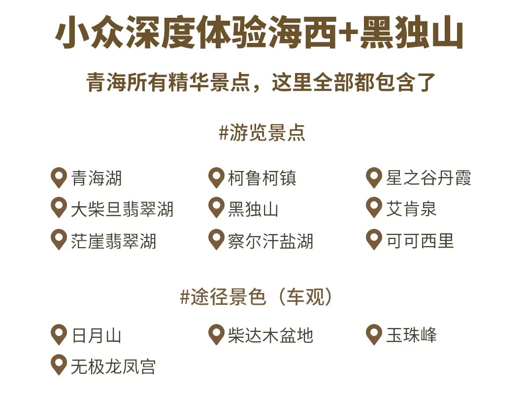03 Delingha - Wilderness Highway - Valley of Stars Danxia - Emerald Lake - Dachaidan Departure from Delingha in the morning, passing through the important location of "Tree of Life" [Wilderness Highway] , located on the outskirts of Delingha City to Baishu Mountain, is a plateau highway that runs through the Gobi and grassland. The highway extends straight to the sky, flanked by the vast Gobi, undulating meadows and towering Baishu Mountains. Here is the filming site for famous scenes such as the galloping mountain patrol team and the migration of Tibetan antelopes in the play. The highway and natural landscape are integrated to show the grandeur and gentleness of the plateau wilderness. Then come to [Star Valley Danxia], the core filming site of the" Muchen 100 "rally in" Flying Life 3 ", located in the uninhabited area of Delingha, which belongs to the unique Yadan-Danxia composite landform of the Qaidam Basin. The landform originated from the Jurassic lake sediments. After billions of years of wind and water erosion, it formed a magnificent landscape of jagged rock layers, dry lake beds and Gobi Desert intertwined. Here is the "natural track" shot by the crew. When the racing car galloped, it raised smoke and dust, and the silver-white gravel was covered with salt crystals in the sun, like an alien surface. After the visit, come to [Dachaidan Emerald Lake] It was originally the mining area of the Salt Lake Mining Team of the Dachaidan Chemical Plant. From above, it is like carefully processed high-quality jadeite and amber turquoise inlaid on the earth, which is beautiful and exciting. Warm reminder: 1. There are few people on the way that day, please be sure to prepare drinking water and dry food. The Qaidam Basin highway is open and the driving speed is fast. When you are free to move, you must follow the command of the leader and pay attention to safety. 04 Dachaidan - Heidu Mountain - Mangya (Huadugou) After breakfast, come to Ink Jiangshan [Heidu Mountain] . This is a place like the moon. A paradise for tourists and a paradise for photographers. Heidu Mountain is unique because the sand is a layer of black gravel on the surface of the sand mountain. After a long time of baptism, the gravel becomes a layer of hard shell. Everyone who walks through Heidu Mountain will consider the end of life here. Its desolation, loneliness, and coldness can instantly attract you, making it difficult to tell whether it is in a painting or a dream. The snow-capped mountains in the distance are even brighter against the black backdrop. 05 Mangya - Aiken Spring - Mangya Emerald Lake - Mangya After breakfast, set out to the sacred spring under the Kunlun Mountains [Aiken Spring] The oval-shaped Aiken Spring is surrounded by no grass and forms a reddish-brown circle. In the center of Aiken Spring is the gurgling spring, which forms a huge "eye". Known as "the eye of the earth", the spring water finally flows into Lake Gaskule; after the drone rises, the rolling spring water, accompanied by the bright and complex tunnels around it, gives people a shocking feeling. Then came [Mangya Emerald Lake] , which is larger and more colorful than Dachaidan Emerald Lake. The colors of the lake are also various, including emerald green, mint blue, amber yellow, milk white, and milk white cliffs on both sides of the road. Emerald Lake is an artificial salt lake, and the lake water in the shape of a field shows oil painting colors. The Emerald Lake covers an area of about 26 square kilometers and has an average depth of 0.5 meters. It belongs to the magnesium sulfate subtype of salt lake, which produces potassium, magnesium, lithium and other elements of good quality. Today, Emerald Lake has become a popular attraction in self-driving clocks. 06 Mangya - Qarhan Salt Lake - Golmud After breakfast, set off after crossing the Qaidam Basin to [Qarhan Salt Lake] , located in the Gobi Sea, with a hot and dry climate. Due to long-term wind and sun exposure, and the precipitation is much lower than the evaporation, the high concentration of brine in the lake is gradually crystallized into salt grains. On the vast lake surface, the heat rises and the waves sparkle, as if it is a sea of blue waves. There are thousands of feet of salt bridges on the salt lake, salt sea jade waves and other landscapes. 07 Golmud - Hoh Xili - viewing Tibetan antelopes - Kunlun Snow Mountain - Golmud (traffic jam changed to Western Queen Mother Yaochi) After breakfast, set off for [Hoh Xili], a vast no-man's land known as "the last piece of pure land on the roof of the world". The landscape of Hoh Xil is unique. The grasslands and snow-capped mountains complement each other, and the scenery is magnificent and mysterious. If you are lucky, you can see rare wild animals such as Tibetan antelopes and wild yaks here, and feel the primitive and pure nature. Note: The section of Golmud-Sonandajie Nature Conservation Station is being repaired, and some sections are bumpy. In case of temporary impassability, we will visit the Western Queen Mother Yaochi instead. (You can disband freely when you return to Golmud today.) 08 Golmud - Xining disbanded After breakfast, depart from Golmud and take the free shuttle back to Xining. Along the way, you can enjoy the magnificent scenery of the plateau and feel the purity and beauty of nature. After arriving in Xining, end this unforgettable trip to Haixi, a secret land. The trip ended successfully, everyone shared the joy and returned to the warm home with full memories. (The last day does not include accommodation, please inform the master in advance of the airport, station, hotel, etc.). Warm reminder: 1. Normally, it will arrive in Xining around 18.00-18: 30 in the afternoon. If you return on the same day, please buy a flight according to the time (or consult customer service now) 2. You can continue to play in Xining, and you can book Xining accommodation on your behalf. 3. For friends who go to Lanzhou, Xining i