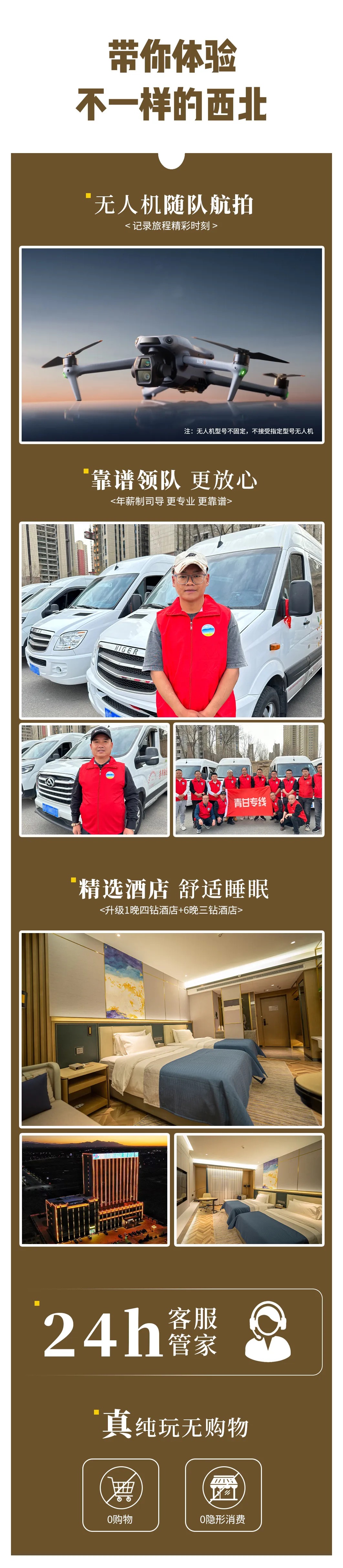Reception Standard Fee Notice Fee includes [Accommodation] 7 nights stay during the trip. One night in a high-end hotel in Xining; One night in a comfortable hotel in Delingha; One night in a comfortable hotel in Da Chaidan; Two nights in a quality hotel in Mangya (Huatugou); Two nights in a comfortable hotel in Golmud; Reference hotel or similar level: (Hotel rooms are tight in peak season, do not specify a hotel, forget to understand) Xining: Jinding Licheng Hotel/Guoluo Hotel/Nature Hotel/Yicai New Silk Road/Combo/Same level; Delingha: Yunhu Hotel/Starway Hotel/Hyatt Regency Oriental/Jinlingdele/Starry City/Same level; Dachaidan: Pixel Hotel/Xiangya Hotel/Chengyue Sunshine Hotel/Xinjin Hotel/Haoyu Hotel/Same level; Mangya (Huadugou): Cozy Hotel/Pinghua Tower/Qingmang Quality Hotel/Xibo Hotel/Same level Golmud: Touan/H Hotel/Magnolia Hotel/Ibis Hotel/Same level [Transportation] Qinghai The charter fee for the car in Gansu (including fuel tolls), the specific model is arranged according to the number of people, 5 seats, 7 seats, 9 seats. Designated models are not accepted, (such as: 4 people are designated to require a 5-seat car, and part of the fee needs to be paid). Each model is subject to full capacity. [Tickets] The first big ticket for the attractions listed: Dachaidan Emerald Lake, Zarhan Salt Lake, Mangya Emerald Lake Transportation Bus, Aiken Spring. (Star Valley does not accept tickets for the time being. If you receive tickets, you need to take care of yourself) [Leading] The team is led by an experienced driver. (The driver is the main driver, and will arrange ticket accommodation and simple itinerary introduction for everyone. Professional explanations are not provided, please understand.) [Meal Fee] 7 breakfasts throughout the journey [Drone] The team is equipped with a drone, one drone for every 3 to 4 cars. The driver will choose 1-2 attractions to take aerial photos for guests [Drop-off] After the trip, you can directly deliver it to Xining Airport, station or city hotel for free. The fee does not include [Large Transportation] To and from Xining all over the country, the train or plane will be at your own expense. [Meal Fee] The fee includes meals other than meals at your own expense. About dining 1. We believe that food is the most representative part of the local culture, and we hope that the group members can discover the local cuisine by themselves during the trip, rather than us preparing a cookie-cutter group meal for you in advance. The joy and charm of this will only be known if you try it yourself. 2. Some destinations have less delicious food to explore. Considering everyone's different eating habits, in order to respect each team member, we do not include meals on most of the itinerary. In this case, everyone can order together or eat separately. [Small Traffic in Scenic Spots] Star Valley Transit Car 60 yuan/person; Aiken Spring Shuttle Car 20 yuan/person; Qarhan Salt Lake Sightseeing Car 60 yuan/person; Black Dushan Small Traffic 60 yuan/person [Personal Consumption] Local self-funded items and other items not included in the "fee included". [Single Room Difference] The itinerary and accommodation are arranged according to the double room, and the registration of individual group members will be arranged in the order of same-sex room sharing. If you bring children of the opposite sex or need to live alone, please make up the single room difference. [Pick-up] You can provide pick-up service from Xining Airport to the hotel, 100 yuan/car for a five-seater car; 200 yuan/car for a seven-seater car. [Free with the car] Mineral water is provided with the car. (If the gift item cannot be given for special reasons, the fee will not be refunded) Refund and change rules If you withdraw from the group within 5 days, the ticket fee will be refunded. If you withdraw from the group within 2 or 10 days, 50% of the group payment will be refunded. If you withdraw from the group for more than 3 or 10 days, you will be refunded the full amount of the group payment. Remarks: 1. Seniors over the age of 65 need to be accompanied by family members to sign for exemption, and those over the age of 70 will not be accepted 2. Everyone takes turns to change the seats on the car (no seat requirements are provided) Warm reminder Registration instructions [Itinerary Remarks] 1. Children: (referring to height of 1.2 meters and below); the fee only includes parking spaces and insurance fees, does not occupy beds, does not include breakfast, and does not include scenic spot tickets. Note: 1 large and 1 small registration cannot be arranged to share a room. Please make up for the room difference and live alone. Please understand! 2. The cost of the itinerary is increased due to human irresistible factors (natural disasters, traffic conditions, government actions, etc.). The company will not refund the unincurred expenses. Our agency can make itinerary adjustments and try our best to ensure the smooth progress of the itinerary. If it is actually impossible to implement the agreed plan, the excess cost due to the change shall be borne by the tourist. 3. The journey time in the itinerary is the reference time without traffic jams, excluding the tour time of the scenic spots; in the case of no reduction in scenic spots, our agency has the right to adjust the order of visits according to the opinions of the guests. Complaints are subject to the tourism opinion form of the local reception agency. Please fill in truthfully. If you fill in falsely or do not fill in the default, it will be no reception problem. If you complain after the return journey, our agency will not accept it. If you are not satisfied with the reception of our agency, please contact our agency as soon as possible so that our agency can coordinate and deal with it. 4. Most of the scenic spots in the itinerary are undeveloped. Please understand if the scenic spot is suddenly closed or suddenly charged. [Highland Tourism Precaut