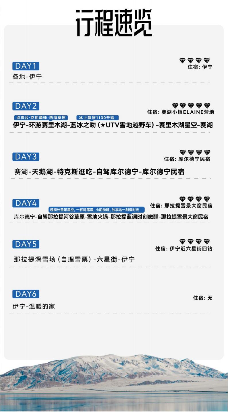 D2 Yining - Around Sailimu Lake (Dianjiangtai, Kohler Yongzhu, Xihai Grassland) - Blue Ice Kiss (★ UTV Snowmobile, Ice Drift starts at 11:30) - ★ Stargazing Sailimu Lake Five Diamonds