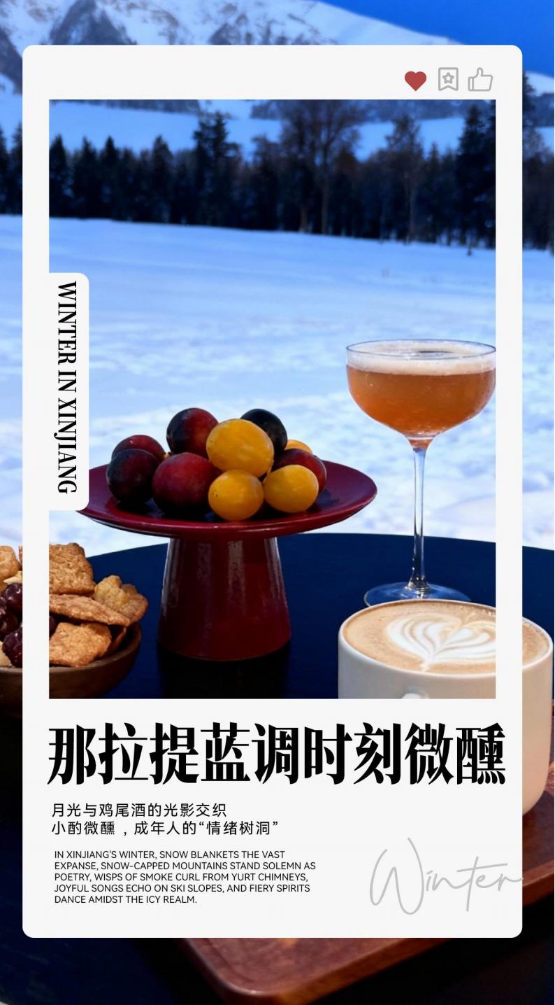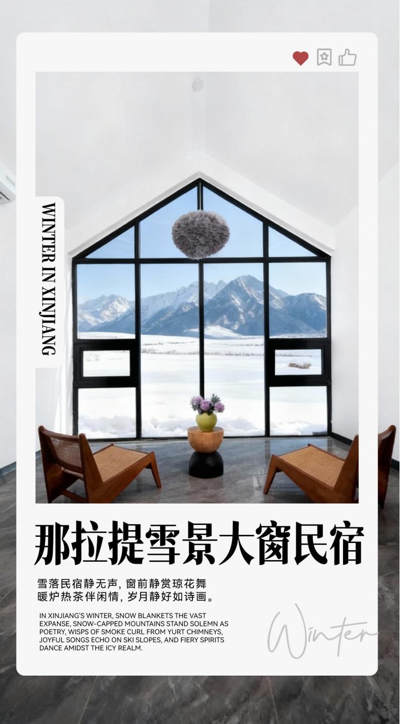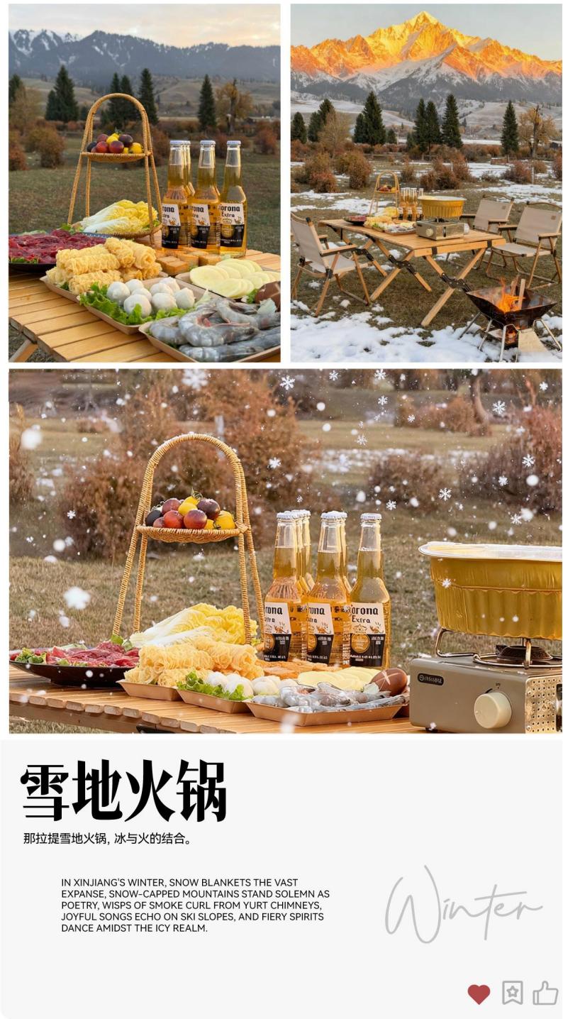 D4 Day 4: Kudenin - Snow Hot Pot - Narati Snow View Homestay Large window viewing [about 180 kilometers, about 2 hours without traffic jams] Reference Hotel: Lingshang Cloud/Mountain and or the same level (can not Designated) The following itinerary time is for reference only, subject to the actual situation: 09:00-09:30 Have breakfast at the hotel and set off! 09:30-12:30 Go to [Nalati] 12:30-18:30 [Self-driving Nalati] One foot on the accelerator shattered the silence of the snowfield, and the moment the car music exploded, our winter Battle with the Nalati Valley grassland officially began! The highway is like a silver slide, with the steering wheel in hand, rushing directly into the ice and snow version of "Speed and Passion" scene. The tip of the withered yellow grass punctures the snow layer, like the grassland is giving us a match, and the jackdaw that is shocked by the wheels is a group performance of this self-driving blockbuster. The Gongnaisi River is frozen into a super cool natural ice sculpture, and the crack lines have their own cyberpunk filters. Moments praise the harvester when they take pictures casually. Roll down the car window, the sour feeling of snow particles on the face is even better than the ice American style with double the lemon! The cooking smoke from the herdsman's yurt and the branches covered with rime fog unlock the winter atmosphere in minutes. Twenty-year-old blood should be on this vast snowfield, pinch freedom and romance! 18:30-19:30 [Snow Hotpot] Eating snow hotpot on the winter snowfield in Nalati is a wonderful experience to cook the cold cold into a hot poetic. Choose a snow slope with a wide view, the wooden frame supports the copper pot, the charcoal fire crackles below, and the white mist condenses as soon as it is served. The pot is rolled with freshly cut mutton rolls from local herders, and the fat and thin meat slices are curled in the clear soup, wrapped in sauce and sent to the mouth, so fresh that you can taste the smell of the grassland. 19:30-20:30 [Narati blues moment slightly drunk + 1 cup of cocktail + fruit plate] Looking out the window at the snowy starry sky, a cup of cocktail, drink slightly drunk, and enjoy this moment of slow time alone; today's warm reminder 1. Please abide by traffic rules on the way to drive. The snow road conditions are slippery. Slow down and avoid sudden braking and sharp turns. 2. The signal in the grassland area is weak. Please download the offline map in advance and keep in touch with your companions. 3. The outdoor temperature is low. Keep warm when eating hot pot and avoid long-term exposure to the cold. Nalati Snow View Big Window Homestay
