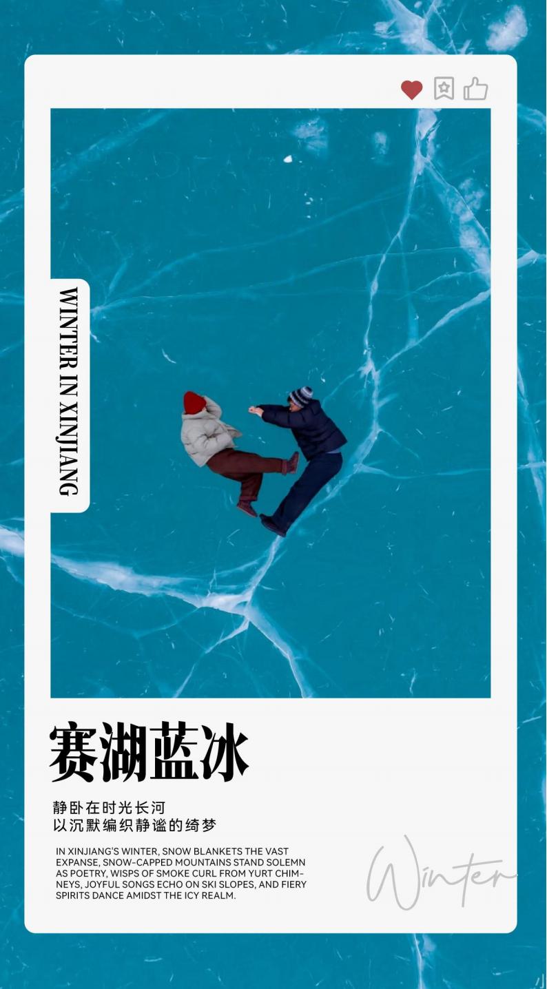 • Self-driving Sailimu Lake: Sailimu Lake in winter is a pure land that is free from the hustle and bustle. Blue ice and white snow are set against each other, like a fairyland on earth.