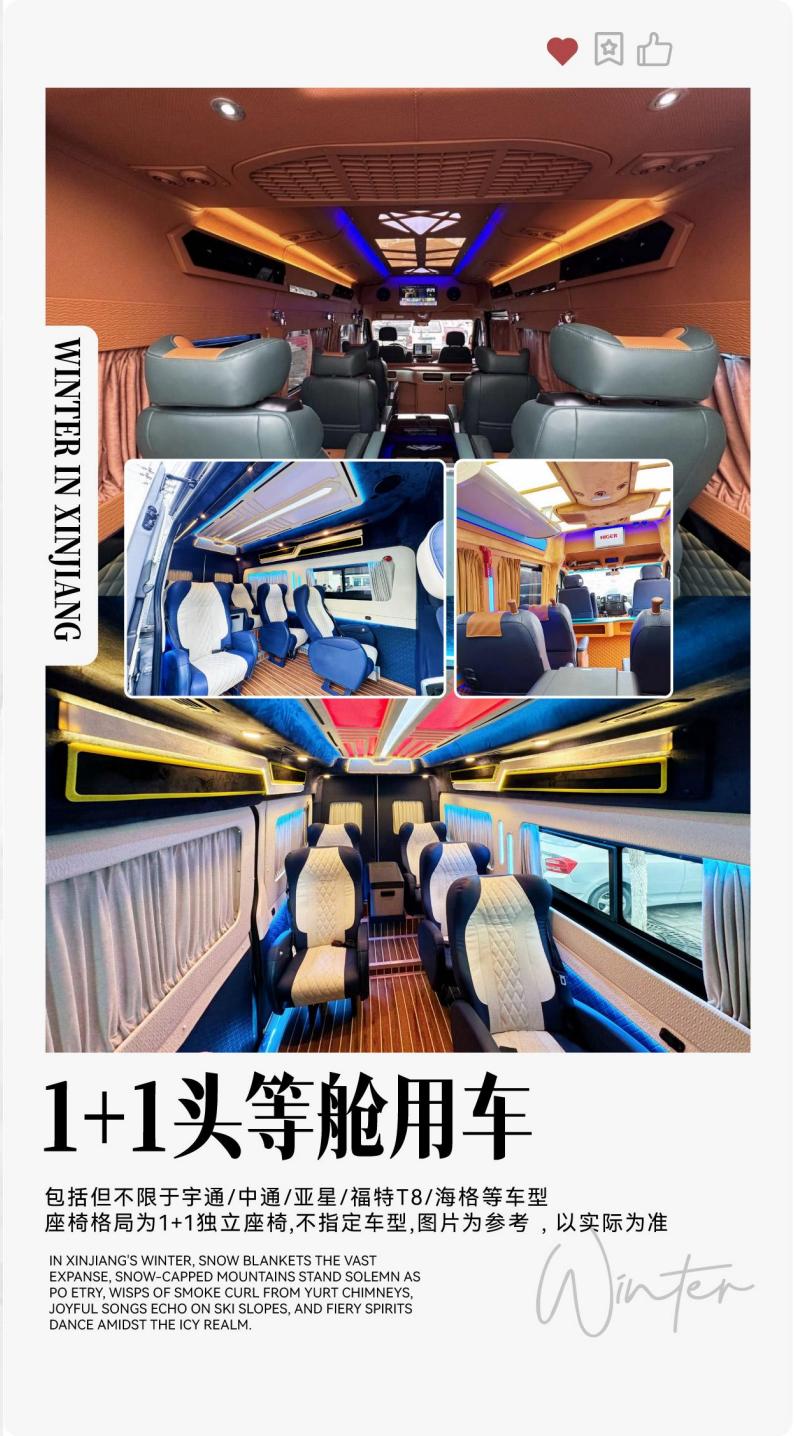 1. Transportation : Large space 1 + 1 seven-seat operation qualification commercial vehicles during the trip, including but not limited to Yutong, Zhongtong, Yaxing, Haige, Jianghuai Xingrui, Ford Fushun and other models. The seat pattern is 1 + 1 independent seat, and the model is not specified. Due to the limited space in the car, it is recommended to limit each person to a suitcase under 28 inches;
