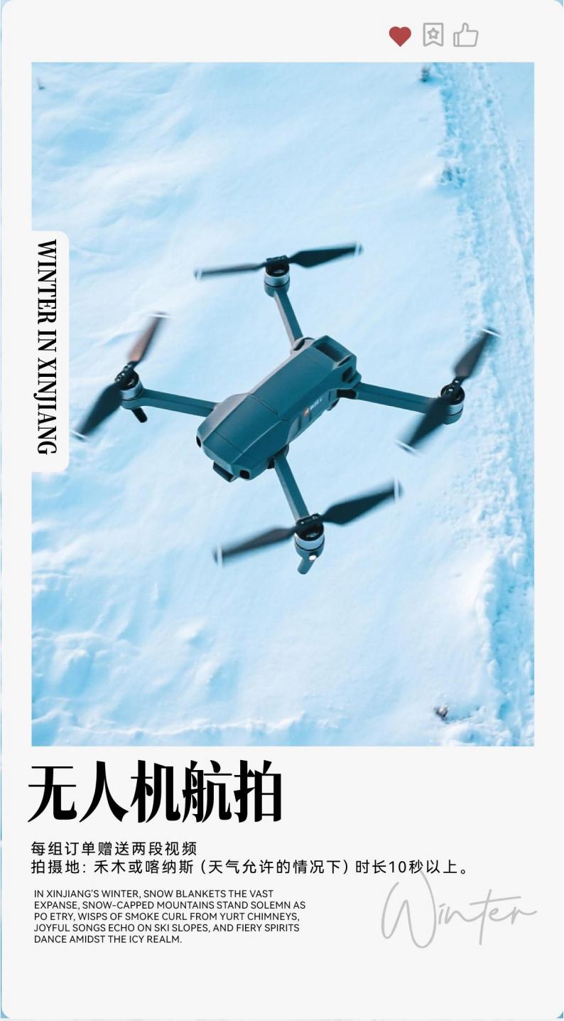 • Drone aerial photography: two videos will be given for each group of orders, shooting location: Nalati/Kudenin/Yuhu/Saihu (weather permitting), more than 10 seconds long.