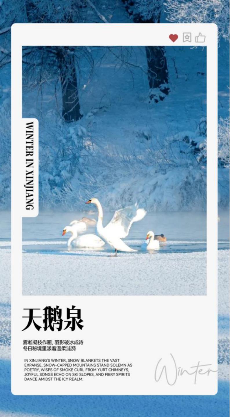 Day 3: Sailimu Lake - Swan Lake - Tex Shopping - Kudenin [About 350 kilometers, about 4.5 hours without traffic jams] Reference Hotel: Spruce/Berlin/Fuguang Photography Home or similar (cannot be specified) The following itinerary time is for reference only, subject to the actual situation: 09:00-09:30 Hotel Breakfast and departure! 09:30-11:00 Go to [Swan Lake] 11:00-12:30 Visit [Swan Spring Wetland Park] When the Yili River Valley is covered with snow, the Swan Spring in Yingtamu Township, Yining County has become a "warm secret land" for swans to winter due to underground hot springs. Here is the largest winter habitat of Mute Swans in China. From December to February of the following year, hundreds of swans (90% of them are Mute Swans, with national secondary protection) will fly over and swim on the non-frozen lake, forming a fairy tale scroll with silver-wrapped rime and snow. Swan Spring in Winter: Like walking into a fairy tale book. Morning is the best time to watch - rime hangs on the branches, the sun shines on the lake, swans sometimes bow their heads to feed, sometimes play and play, and the white feathers are matched with the ice and snow, like "snow elves". In extremely cold weather, the dense water vapor on the lake surface adds a hazy feeling, as if you are in a dreamy world of ice and snow. 12:30-14:30 Head to Bagua City [Tex]~ Break into Bagua City without traffic lights and look for the mystery of Tai Chi in the streets. Taste the food of Tex Town by yourself. 16:00-18:00 [Self-driving Kudenin] Enjoy the scenery of the North in American TV dramas. The "creaking" sound of wheels running over the snow is the most gentle love letter Kudenin wrote to travelers in winter. Driving along the winding road into the secret realm, the vigorous spruce is draped in a white velvet robe, and the rime falling between the branches reflects the fine starlight in the sun, as if it has broken into the ice and snow fairy tale. Outside the car window, the frosty lake reflects the Dai-colored mountains, and groups of horses gallop on the snow, and the snow fog raised by the cold mountain wind pounces into the car window. Stop at the viewing platform, exhale white mist and condense into frost, and frame the car shadow into the camera with the continuous snow-capped mountains - the original romance of self-driving is that you can stop for a beautiful scenery at any time, and embrace Kourdening's winter in the vast world. 20:00-20:30 Check in Kourdening Snow View Big Window Homestay. Today's warm reminder 1. The swans in Swan Lake retain their most natural state and are not deliberately guided by humans. Whether they can meet these smart friends depends on our good luck. This unexpected surprise is even more precious! 2. Friends who want to have close contact with swans can bring some naan in advance and throw it into the lake. The little swans will be super happy~ 3. Don't go near the guardrail/edge of the lake, don't go into the water without authorization, take good care of the children~ Kudenin