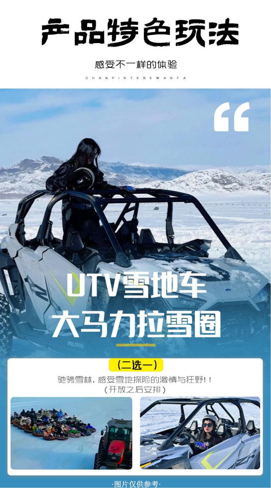 • Sailimu Lake UTV snowmobile/Big Marina La Snow Circle (arranged according to weather conditions, open arrangement, choose one of the two), feel the speed and passion of the blue ice lake.