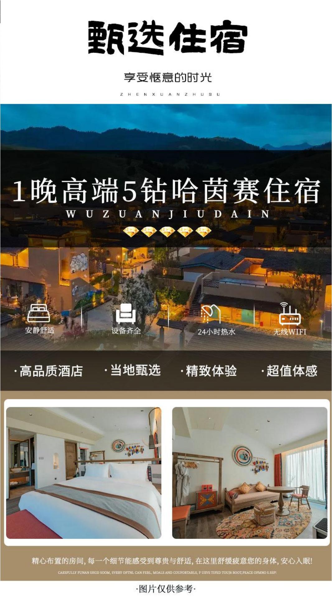 1 night 4-diamond hotel in Urumqi near Bazaar + 1 night 4-diamond hotel in Urumqi Huazhu Hotel mid-to-high-end + 1 night high-end 5-diamond Hainsai accommodation + 1 night Sailimu Lake East Gate camp + 2 nights 4-diamond accommodation, either living in the scenery or in the comfort~