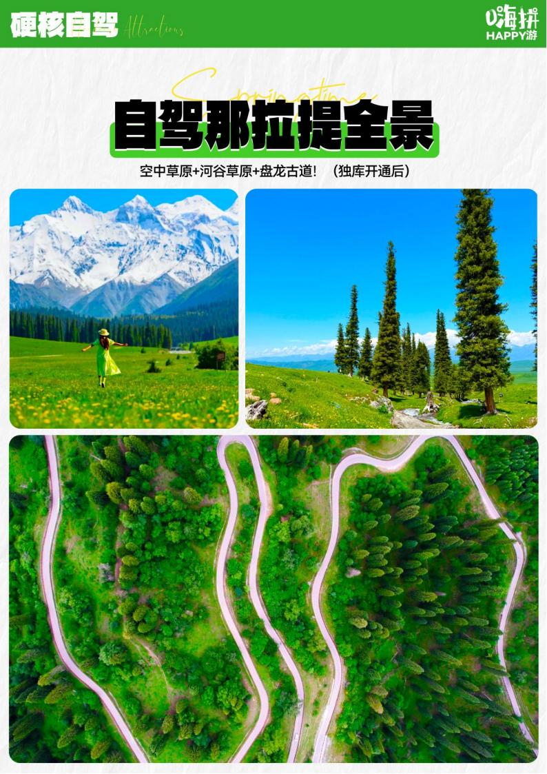 09:00-16:00 [Self-driving into the Neralati grassland in the sky grassland], one of the four major alpine grasslands in China, with an average altitude of more than 2,000 meters. The Guns River, which meanders westward at the foot of the mountain, flutters like a sparkling blue ribbon in a wide valley. The mountains are stacked on both sides, and the clouds are billowing. There is a great potential to "roar up to the sky, and white clouds come from thousands of miles". Looking up at the blue sky, a few goshawks are circling leisurely. Looking at the grass like a blanket, groups of cattle and sheep are wandering comfortably on the slopes. From time to time, herders gallop on horses, startling a flying red... Take care of lunch at noon; [Self-drive into the Nerati River Valley Grassland + Panlong Ancient Road], which integrates blue sky and white clouds, glaciers and snow peaks, forest grasslands, canyons and rivers. It has been rated as "the most populous grassland in Kazakhstan" and "the grassland with the most yurts in Kazakhstan" by the Shanghai World Guinness Headquarters. It is an "open-air museum" that reflects and displays the traditional living habits of the Kazakh people;