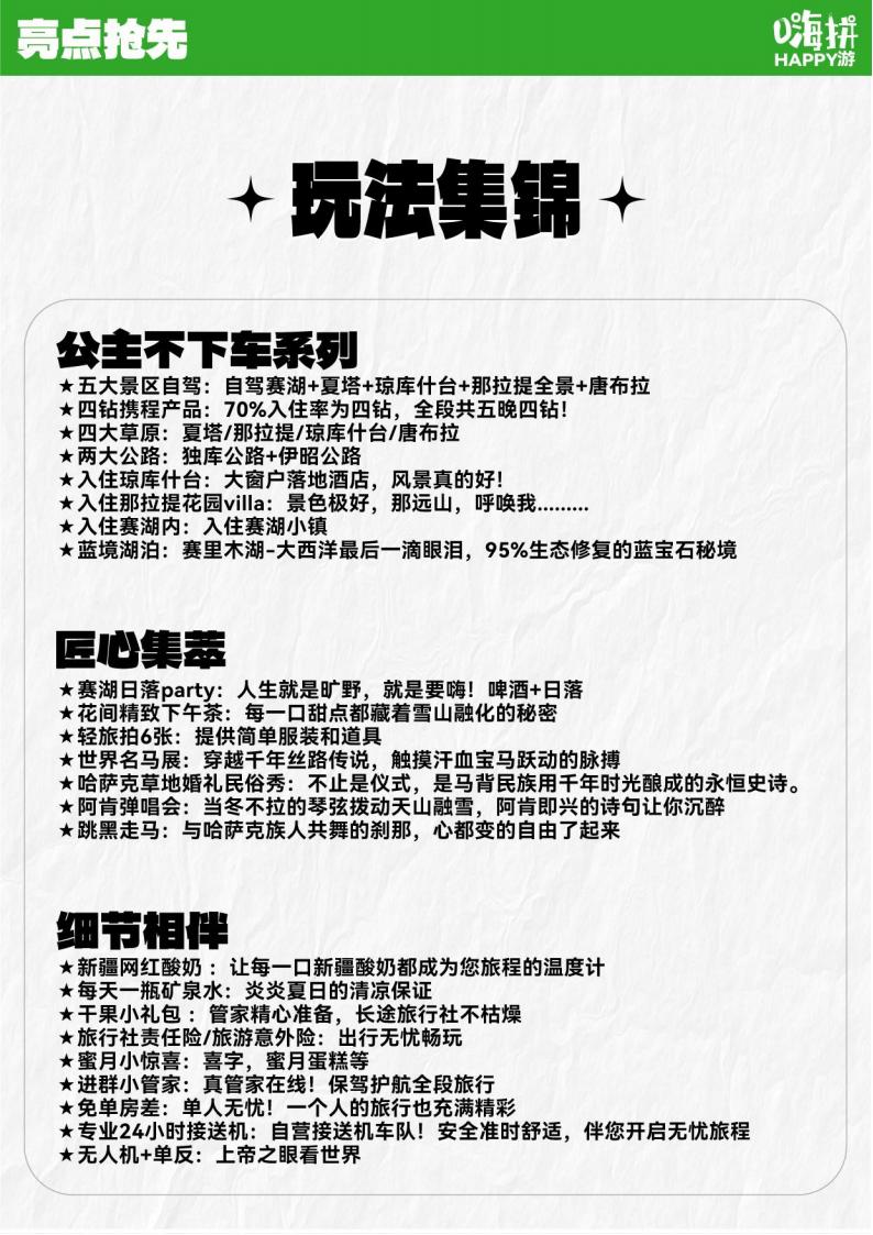 [Order courtesy] Saihu Sunset Party: A cry for freedom, let us release our energy to the fullest, and integrate with this magnificent Sailimu Lake sunset! Give away Saihu sailing boat to sea: enjoy the visual feast of dancing with the lake! Nalati flower sea afternoon tea: flower shadow swaying, slow taste of time! Flower sea light photography: give away 6 photos with sweat blood BMW: Rolls-Royce on horseback, heroic, handsome and noble, experience horseback travel drone + DSLR: give away two videos (weather permitting), each video lasts more than 10 seconds, the driver is equipped with SLR camera, no less than 9 per person throughout the process. Travel courteously: This itinerary is funded by the travel agency to buy a travel accident insurance for you. Snacks on the car: dried fruit packets/yogurt/honeymoon photo props